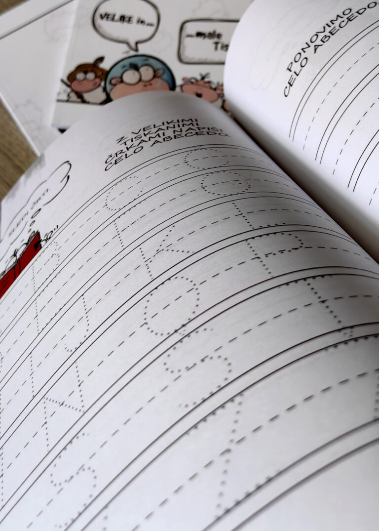 Delovni zvezek obsega 116 strani in vašemu malčku na zabaven način predstavi velike in male tiskane črke. Timi jim je pripravil zabavne naloge, kot so risanje vzorcev, pobarvanke in labirinte, ki bodo dolgočasno učenje spremenili v pravo zabavo.