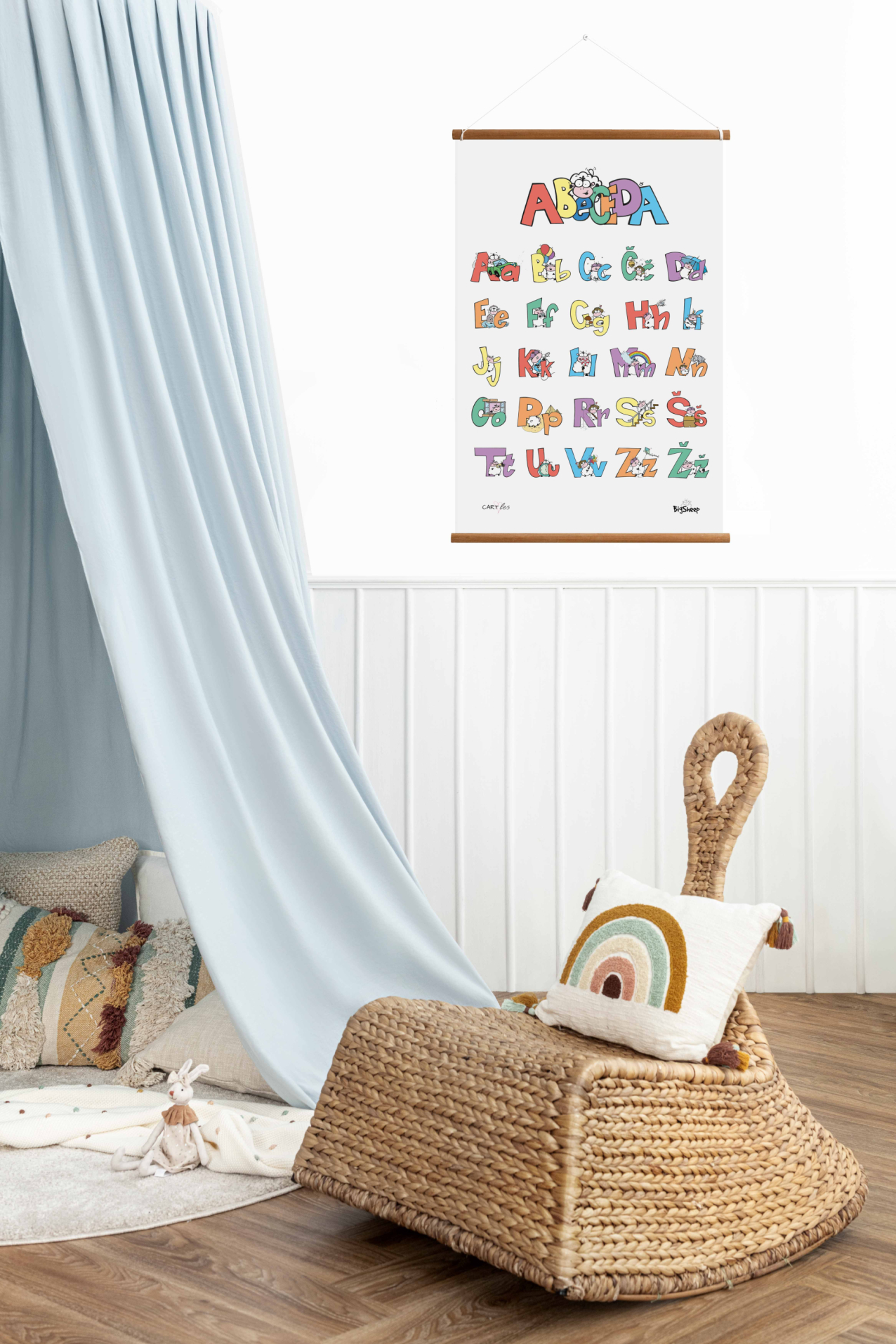 Plakat Abeceda je odličen pripomoček za zabavno in podzavestno učenje črk. Otroci povezujejo zabavne ilustracije s posameznimi črkami in se s tem nezavedno tudi učijo. S pomočjo plakata se otroci hitreje naučijo prepoznavati in zapisovati črke.